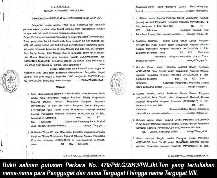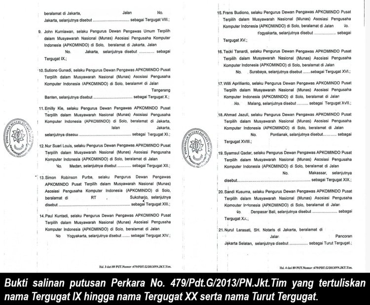 Keputusan tersebut kemudian berlanjut pada gugatan hukum pada tahun 2013 dengan perkara Nomor 479/PDT.G/2013/PN.JKT.TIM di Pengadilan Negeri Jakarta Timur. Dalam salinan putusan perkara tersebut tertuliskan nama-nama anggota DPA APKOMINDO masa bakti 2008–2011, yaitu: Sonny Franslay, Agus Setiawan, John Franco, Efendi Ruslim, Chris Irwan Japari, Wiriadi Tirtariyadi, Hidayat Tjokrodjojo, Iwan Idris, Kunarto Mintarno, Henky Gunawan, Rudi Rusdiah, Jackson Ong, Jimmy Suhalim, Nana Osay, serta Henky Tjokroadhiguno.