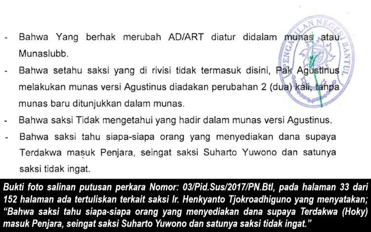Dalam persidangan perkara tersebut terungkap adanya pihak yang menyiapkan dana agar Hoky masuk penjara. Salah satu nama yang disebut menyiapkan dana tersebut adalah Suharto Juwono. Keterangan tersebut disampaikan oleh saksi Ir. Henkyanto Tjokroadhiguno dan tercantum dalam salinan putusan perkara Nomor 03/Pid.Sus/2017/PN.Btl di Pengadilan Negeri Bantul.