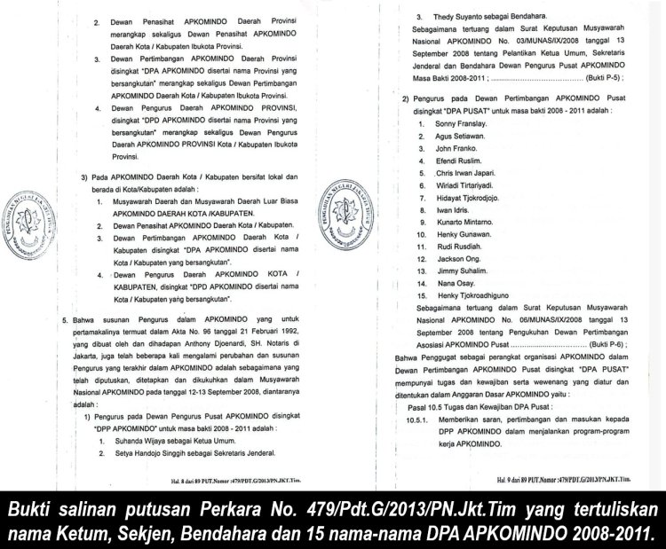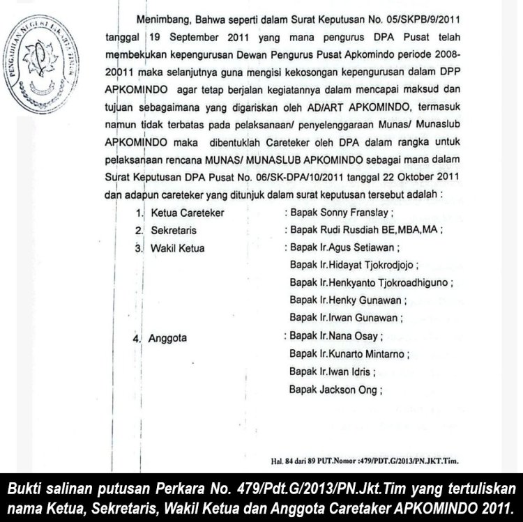 Dalam salinan putusan perkara tersebut juga disebutkan bahwa pengurus DPA Pusat membentuk Caretaker DPP APKOMINDO dalam rangka pelaksanaan rencana MUNAS/MUNASLUB APKOMINDO, melalui Surat Keputusan DPA Pusat Nomor 06/SK-DPA/10/2011 tanggal 22 Oktober 2011.