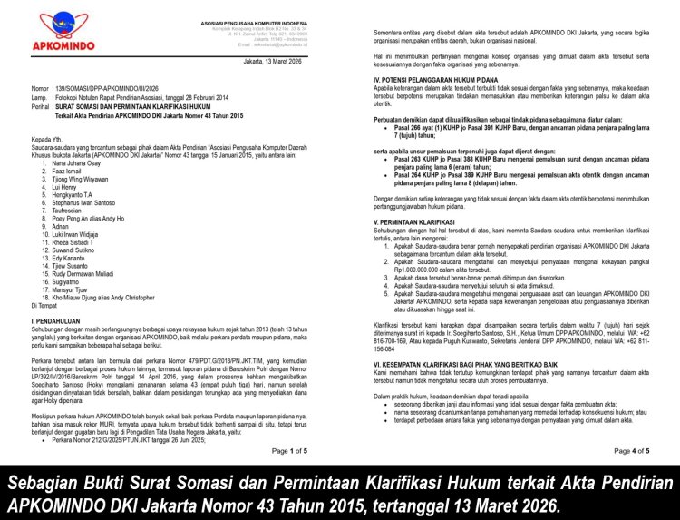 Oleh karena itu, Hoky bersama Puguh Kuswanto selaku Sekretaris Jenderal DPP APKOMINDO telah menyampaikan surat somasi kepada 18 pihak yang tercantum sebagai pendiri dalam akta tersebut.