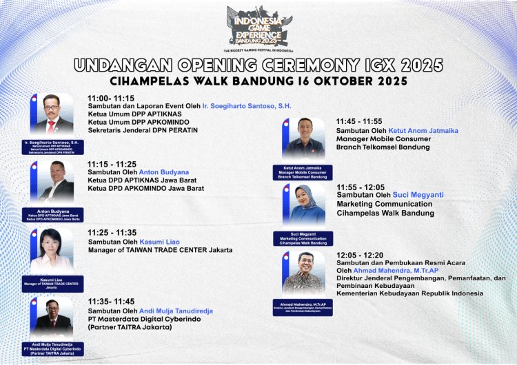 “Melalui IGX 2025 di Bandung, kami tidak hanya ingin menghadirkan festival game yang meriah, tetapi juga membangun fondasi yang kuat untuk masa depan industri game dan konten digital Indonesia. Kolaborasi antara teknologi, budaya, dan kreativitas adalah kunci untuk menciptakan inovasi yang memiliki identitas khas Indonesia dan mampu bersaing di kancah global,” ujar Ir. Soegiharto Santoso, S.H., mewakili para asosiasi penyelenggara.