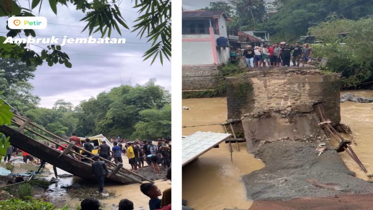 Jembatan Kali Sapi penghubung Desa Petir dan Pucung Bedug, Purwanegara, ambruk saat truk pasir melintas. Sopir selamat, warga lakukan evakuasi gotong royong, jembatan sementara segera dibangun.