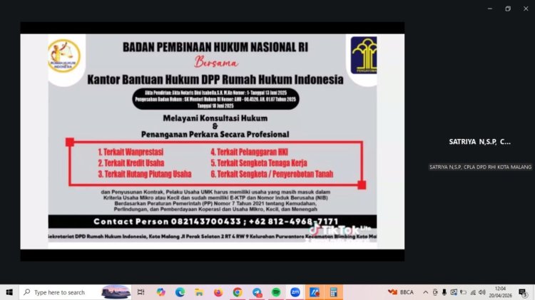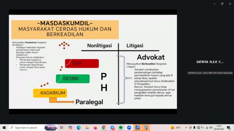 Webinar ini menghadirkan narasumber berkompeten, Satriya Nugraha, S.P., CPLA, selaku Ketua DPD Rumah Hukum Indonesia Kota Malang, yang memiliki pengalaman dalam pendampingan hukum masyarakat serta pengembangan peran paralegal di tingkat desa.