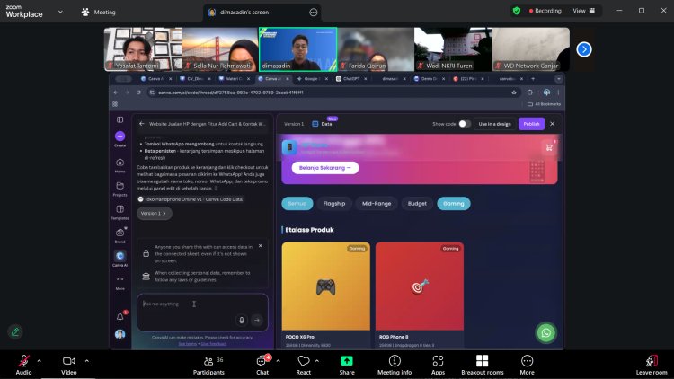 Memasuki sesi inti, Dimas mempraktikkan langsung pembuatan website jualan ponsel menggunakan fitur AI di Canva. Dimas menunjukkan betapa mudahnya merancang landing page hanya dengan memasukkan perintah teks (prompt).