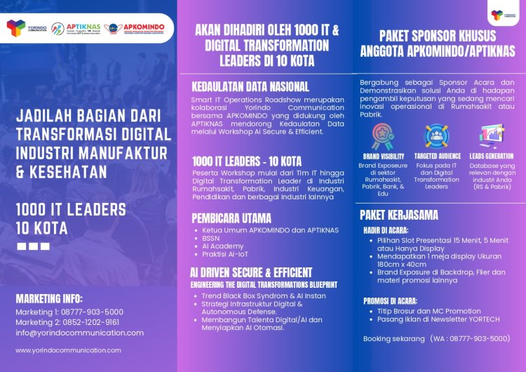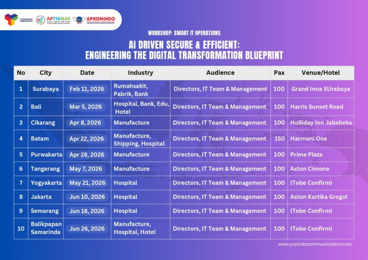 Menjawab tantangan tersebut, Yorindo Communication bersama APKOMINDO dan didukung oleh APTIKNAS serta BSSN RI, menyelenggarakan Smart IT Operations Roadshow 2026. Mengusung tema "AI Driven Secure & Efficient: Engineering The Digital Transformation Blueprint", rangkaian workshop ini akan menyambangi 10 kota di Indonesia dengan target menjaring 1000 pemimpin IT dan transformasi digital dari berbagai sektor industri.
