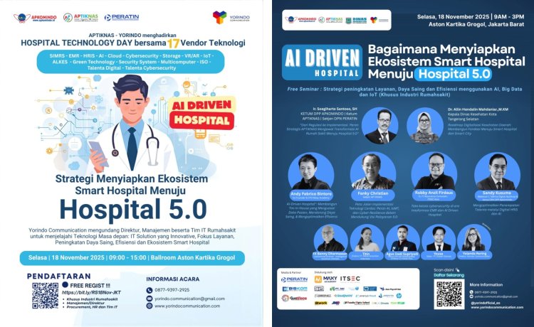 GUETILANG.COM, Jakarta – PT Yorindo Komunikasi Teknologi (Yorindo Communication), dalam kolaborasi strategis dengan Asosiasi Pengusaha TIK Nasional (APTIKNAS) serta didukung penuh oleh Asosiasi Pengusaha Komputer Indonesia (APKOMINDO), telah sukses menyelenggarakan acara strategis bertajuk "AI Driven Hospital: Bagaimana Menyiapkan Ekosistem Smart Hospital Menuju Hospital 5.0". Acara yang berlangsung di Hotel Aston Kartika Grogol, Jakarta Barat, pada 18 November 2025 yang lalu.